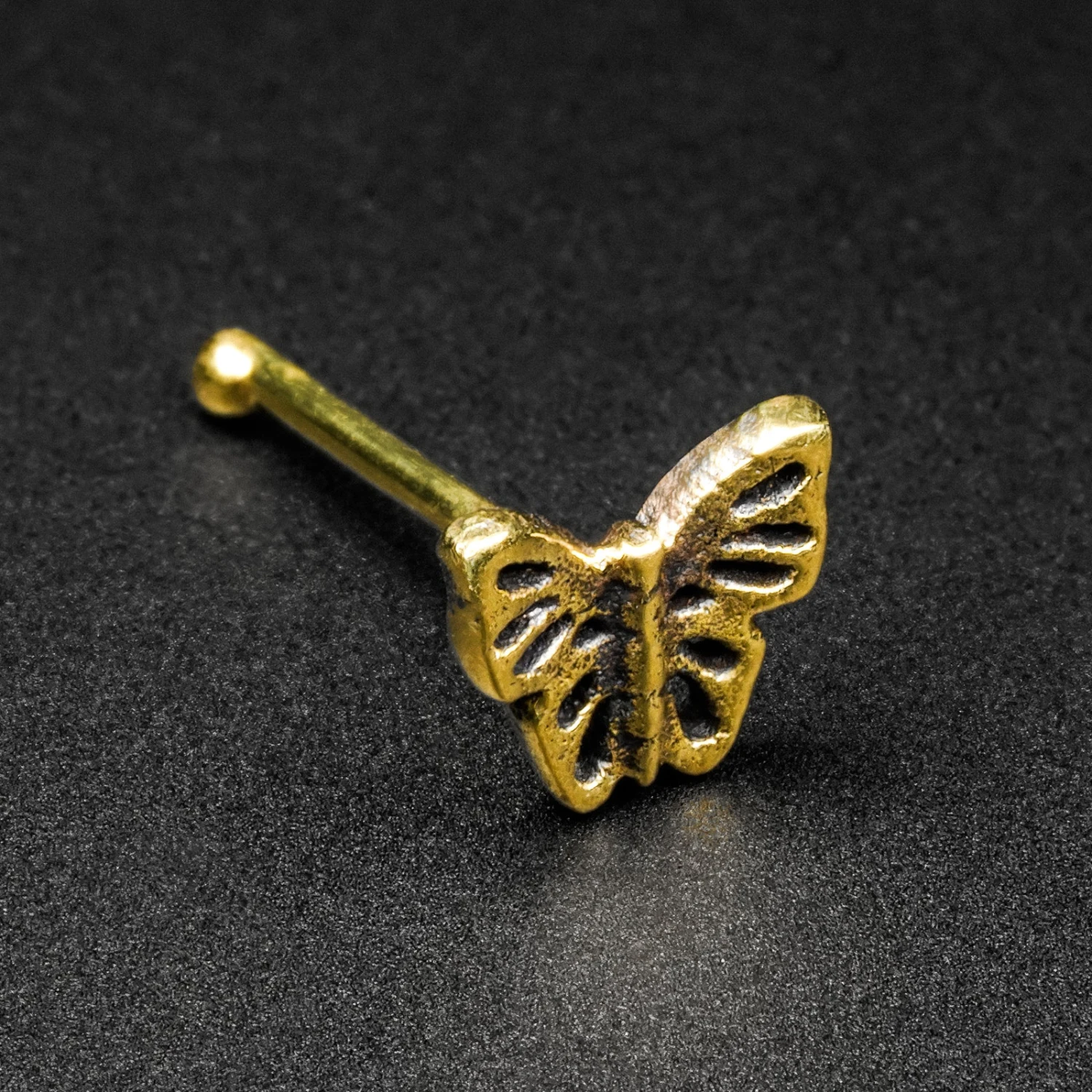 This type of nose stud works by having a fixed ball slightly larger than the bar gauge size to keep the stud securely in place. These Butterfly design nose bones are crafted from Italian brass that is free from lead, nickel, and cadmium.