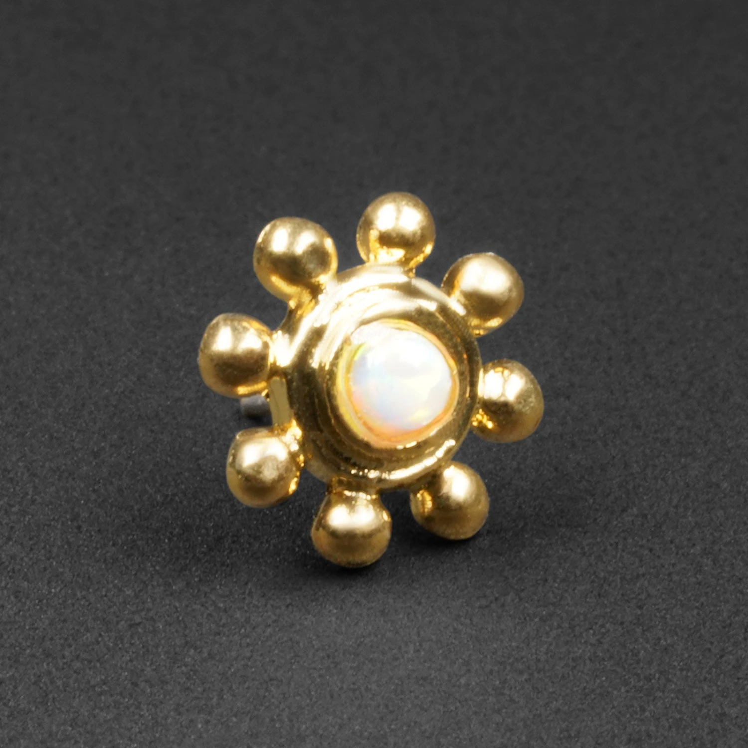 Swap out your bland jewellery with these stunning Dot Flower Synth White Opal threadless tops. Handcrafted from Italian brass and plated with 18k yellow gold.