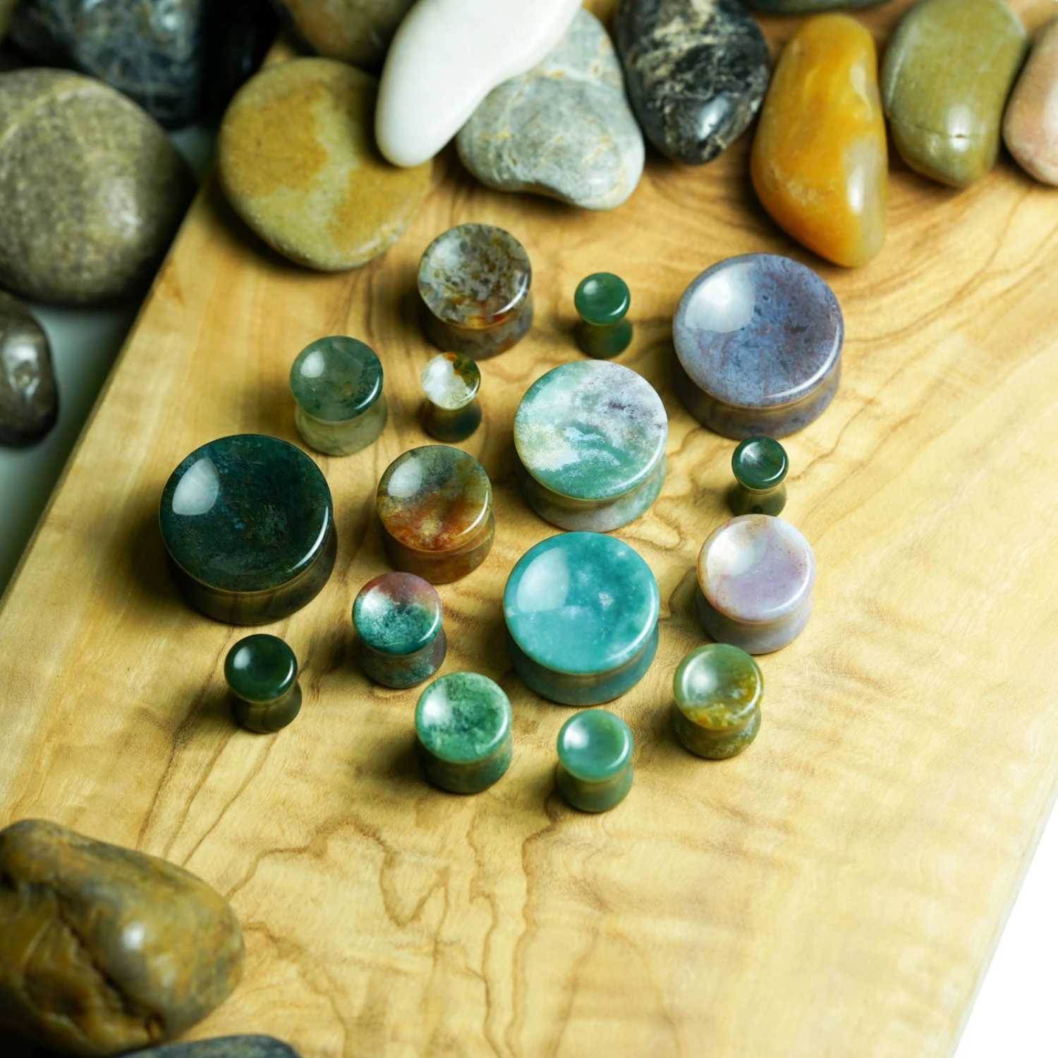 Due to the natural patterns of our Indian Agate, please expect some variation in the stone colour and pattern. Smaller stone plugs are more liable to contain a single colour.