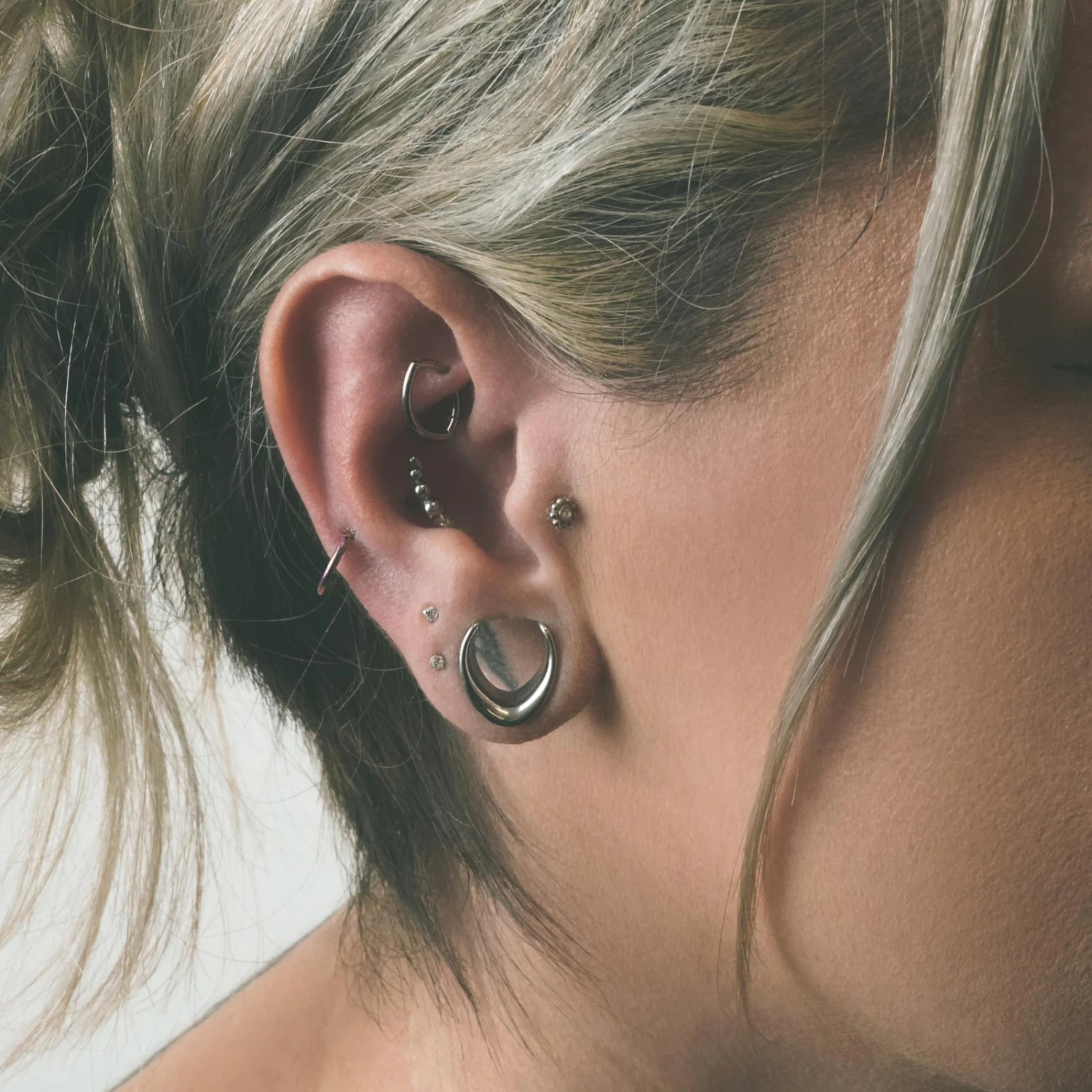 These Oval-shaped implant-grade titanium hinged segment rings are perfect for your daith piercing but can be worn in numerous body piercings including the septum!