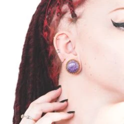 Brass Saddle Fit Double Flare Plug With Amethyst Stone Inlay