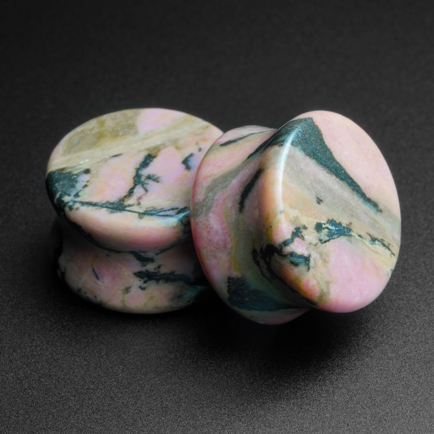 This vibrant Rhodonite stone makes the perfect material for a pretty in pink plug! Handcrafted and polished to a glass-like finish, these Rhodonite Plugs have a super smooth saddle double flare fit. The contrast of dark and light tones in this stone makes for some very fabulous jewellery.