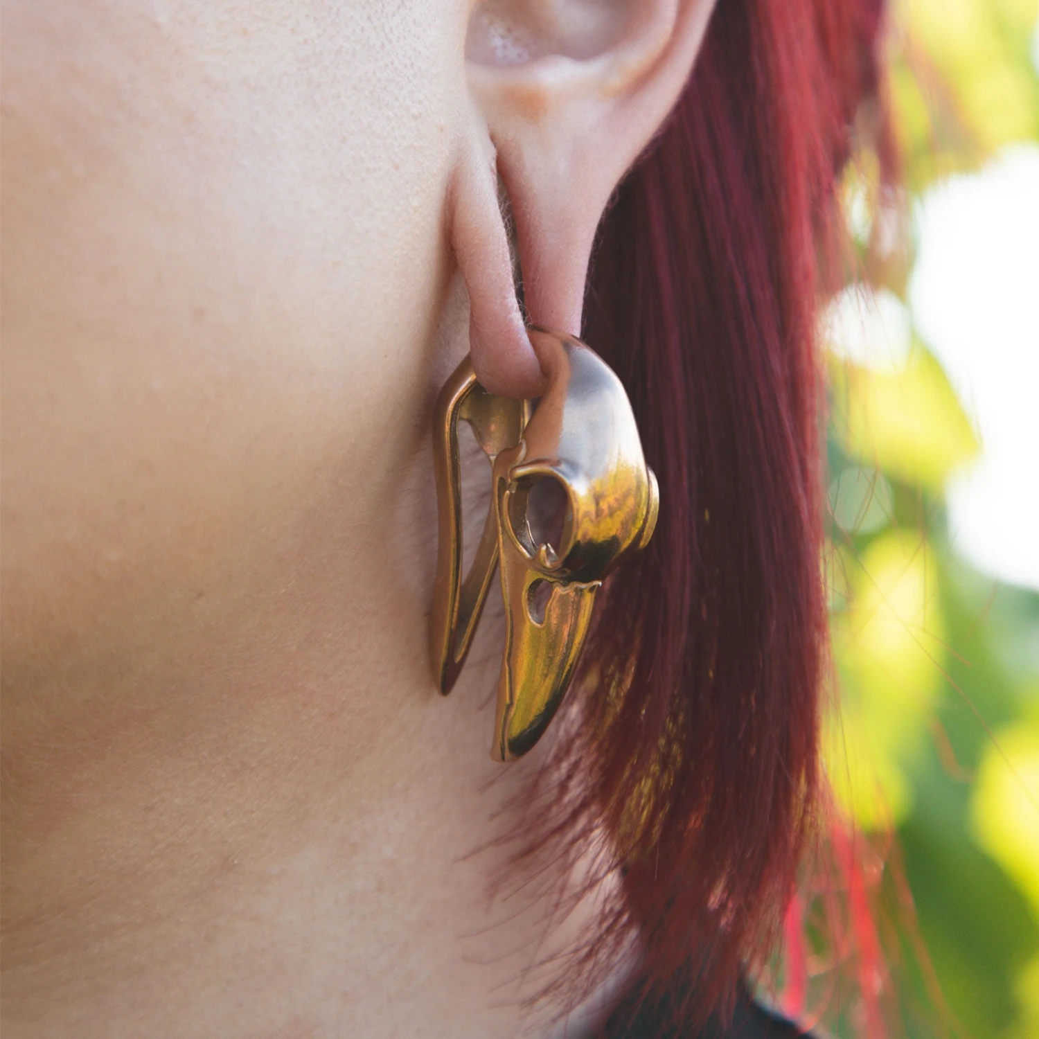 These shiny skulls are made from PVD stainless steel and look great in this stunning rose gold colour. Make a statement with these three-dimensional bird skull ear hangers. You’ll need at least lobes stretched to 12mm (1/2″) to wear these beauties.