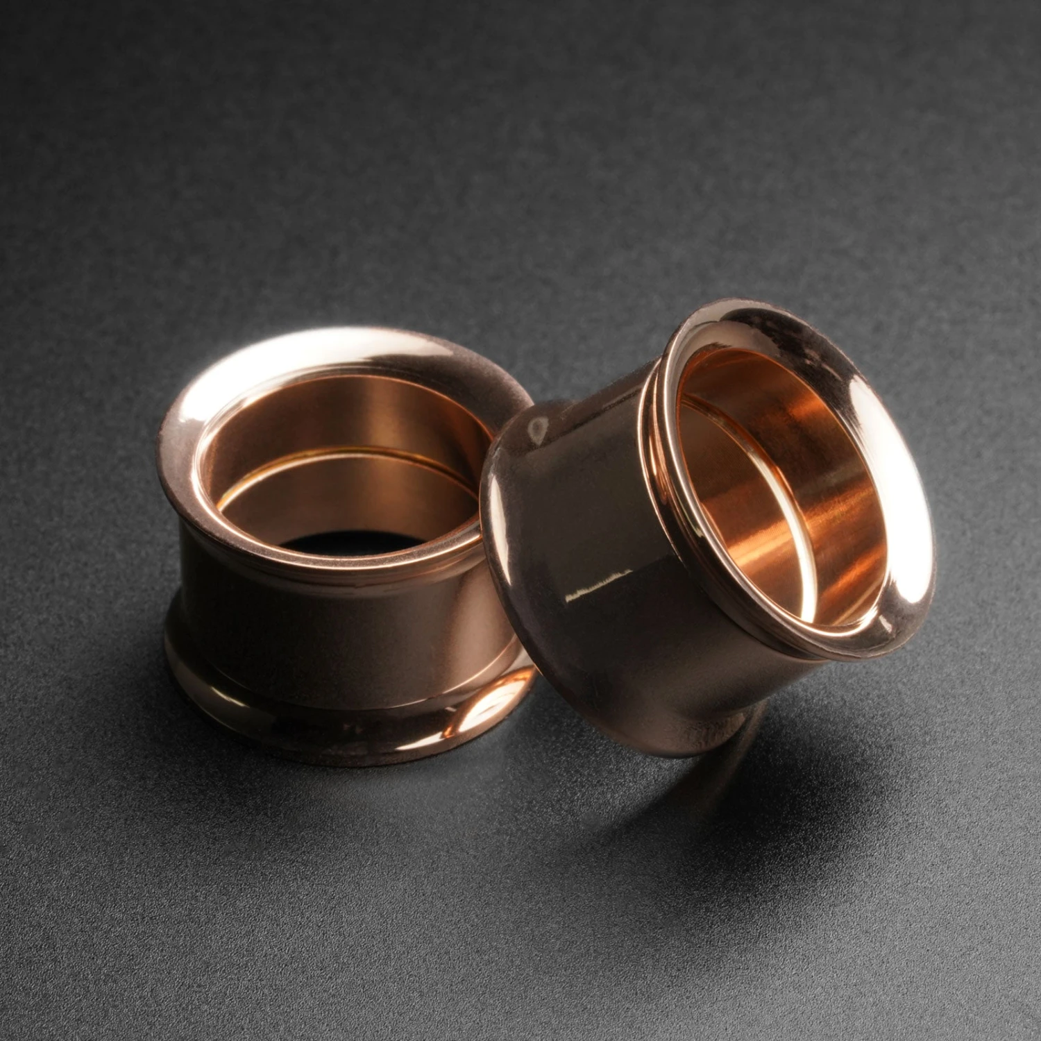Stunning rose gold-coated surgical steel flesh tunnels. PVD coating with internally threaded screw fit flare for easier insertion. Physical Vapor Deposition is a process that coats a base material, in this case, 316L Surgical Steel giving a desired colour or finish – basically, it makes steel look sexier.