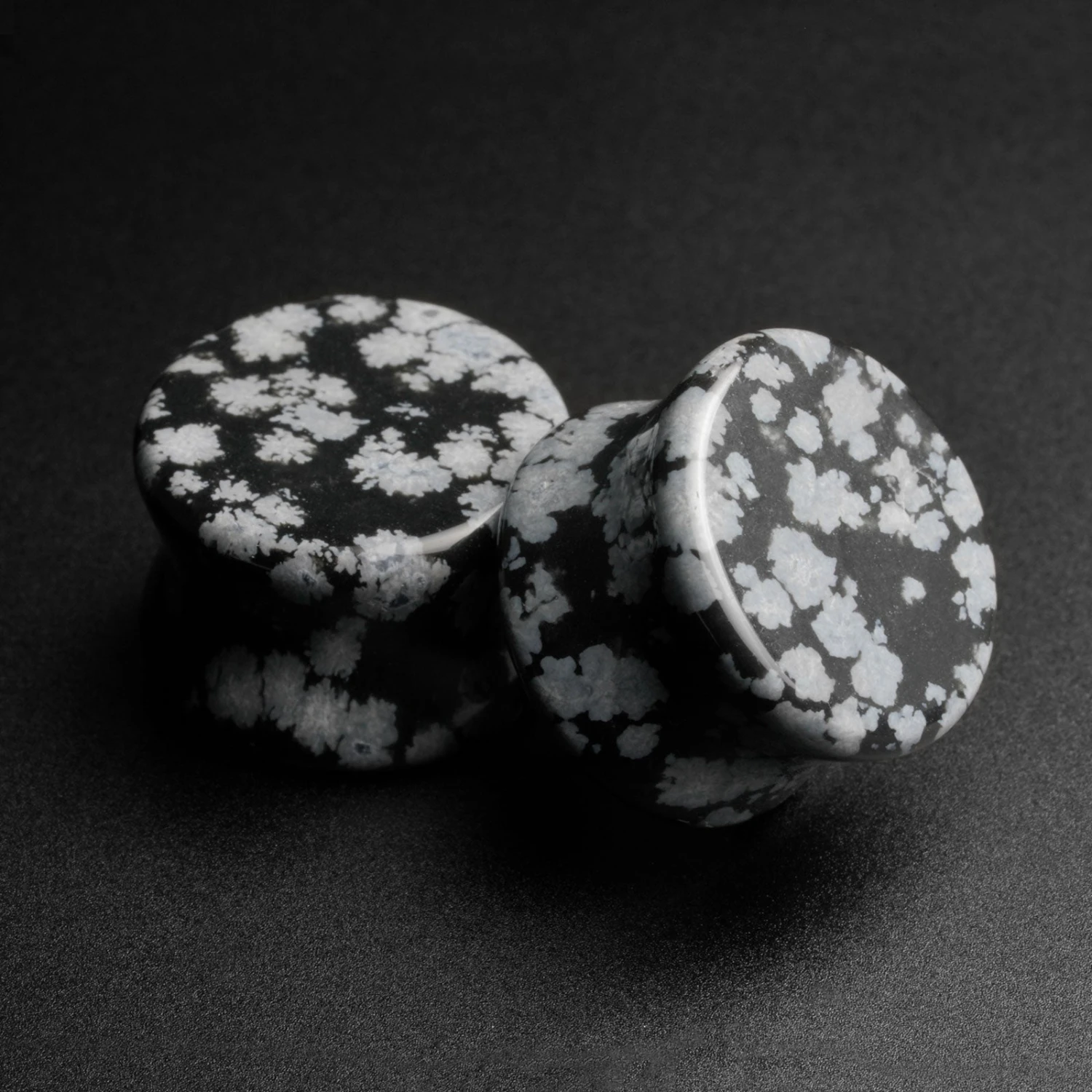 Check out these Snowflake Obsidian stone plugs, flat facing with crafted into a double flare. Snowflake Obsidian is a dark volcanic glass with spherulites. Superb, high-quality stone. These obsidian plugs are handcrafted and polished to a perfectly smooth finish.
