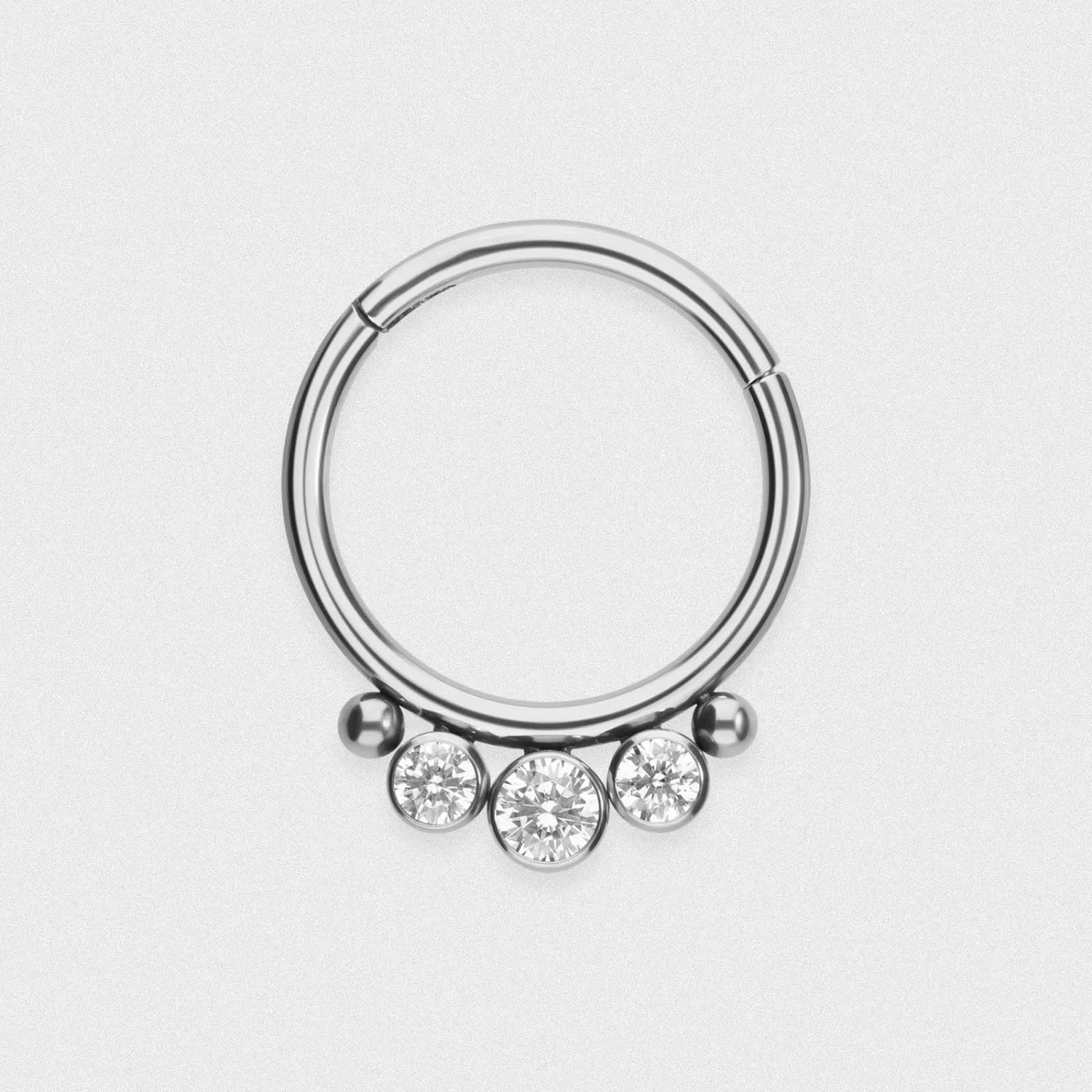 We stock an awesome range of septum clickers here at SIBJ. Here we have a Triple Jewel Dot design that looks stunning no matter your style. Each piece is bejewelled with super high-quality grade AAA clear cubic zirconia stones.