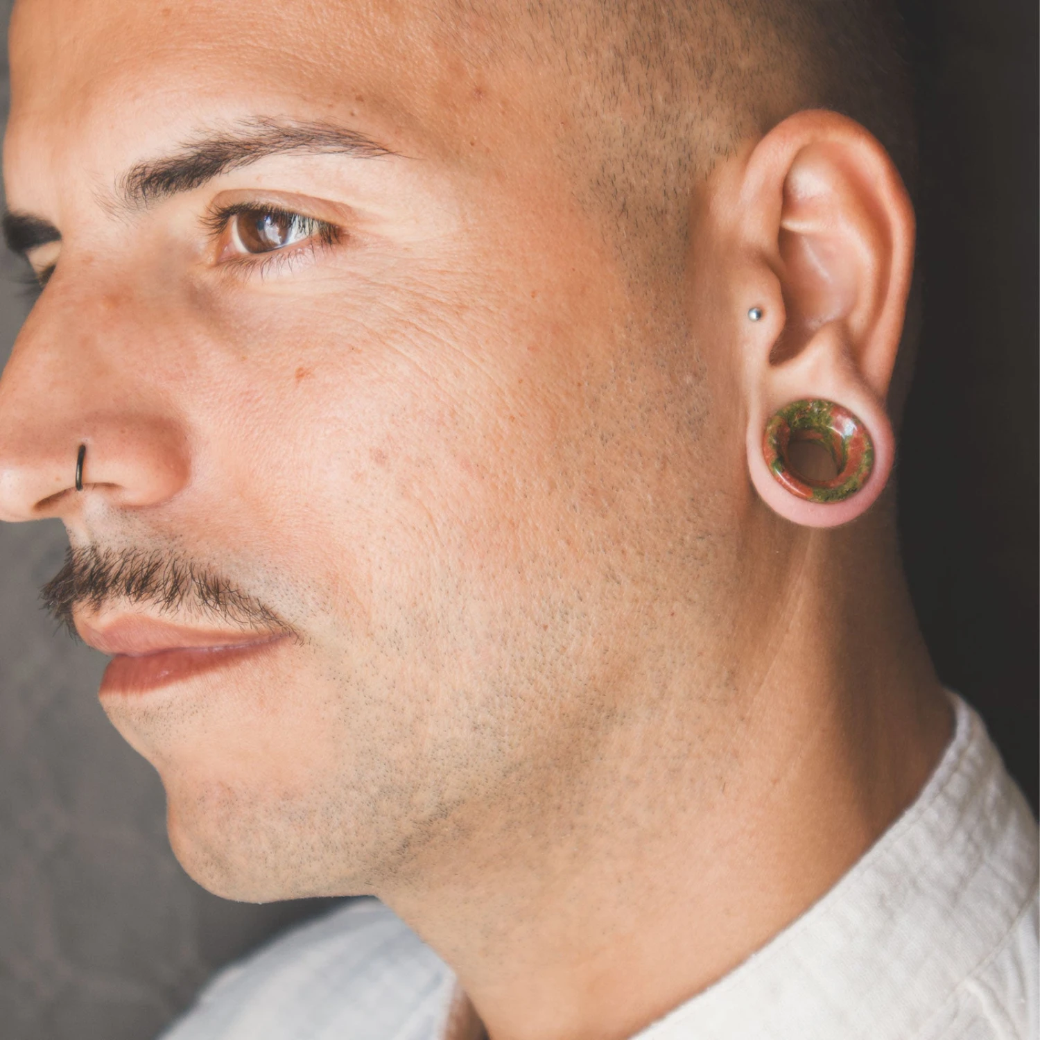 Check out these Unakite Double Flare Stone Tunnels, hand polished and super smooth. They come in a concave finish making them super lightweight for stone jewellery. Immaculate polish throughout.