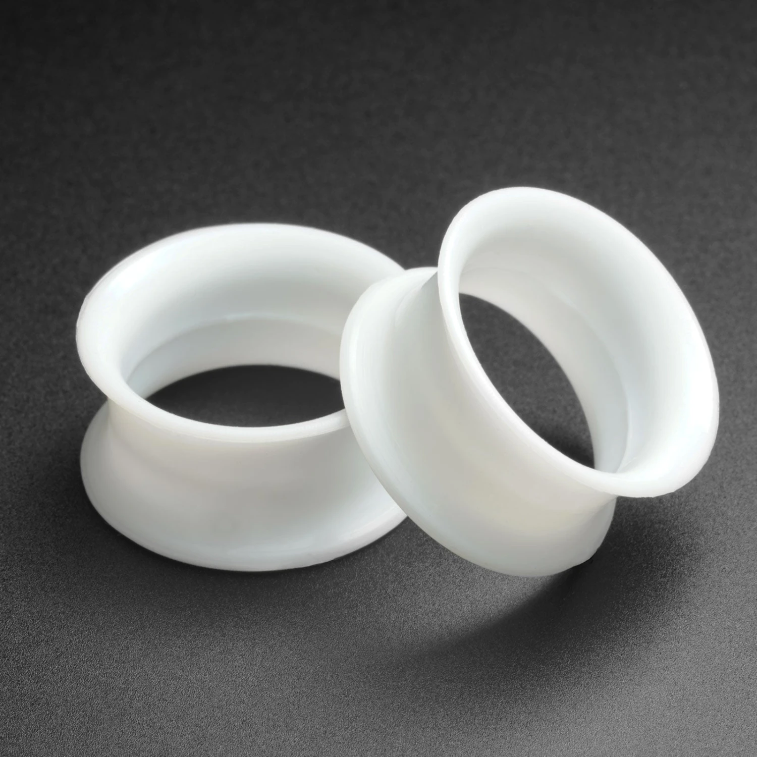 White silicone tunnels, so thin you’ll forget they’re in. Silicone tunnels, even double flares are super easy to insert and really comfortable to wear. Perfect for hat, helmet, headphone-wearing, and sleeping!